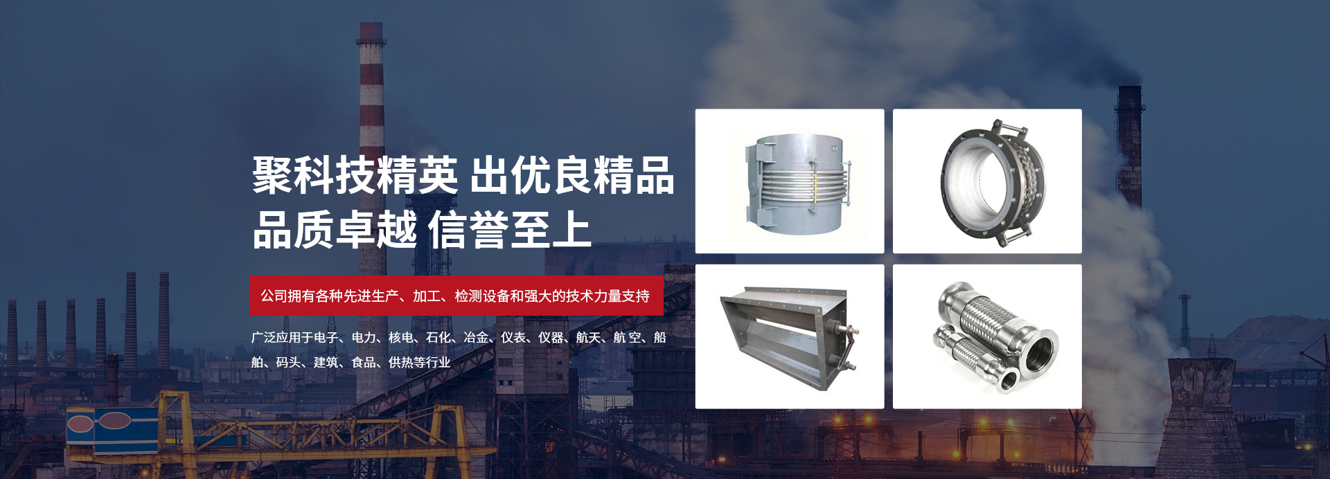 02 / 04  產(chǎn)品廣泛應(yīng)用,與多家企業(yè)合作產(chǎn)品廣泛應(yīng)用于電子、電力、核電、石化、冶金、儀表、儀器、航天、航 空、船舶、碼頭、建筑、食品、供執(zhí)管等行業(yè),先后為數(shù)百家大型企業(yè)提供各種型號(hào)的優(yōu)質(zhì)補(bǔ)償器。